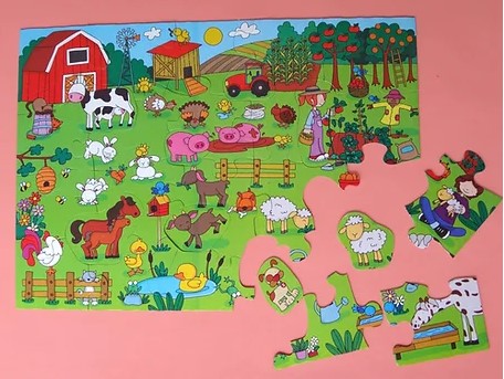 Incluye 28 piezas de cartón extra gruesas. 2 niveles de dificultad con 8 piezas enteras para encastrar: Vaca, Caballo, Tractor, Chica, Chancho, Cabrito, Oveja y Perro.
